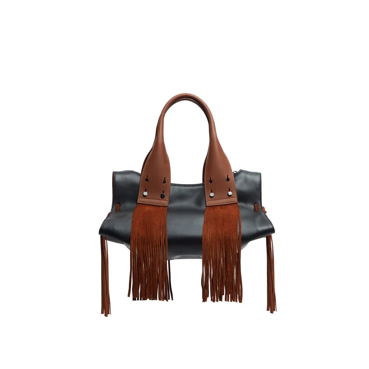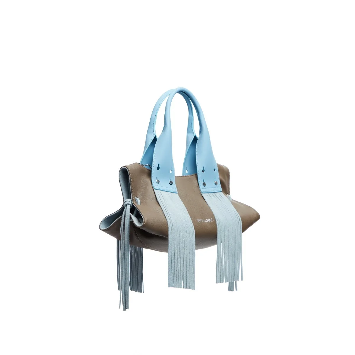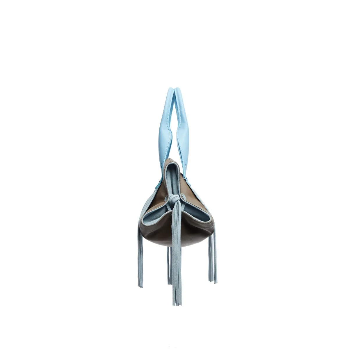 Shirred and tasselled. Elliptic opening shape. Unique sided shape like a piece of art. Pre-modern and oversize handle.
