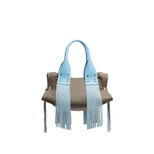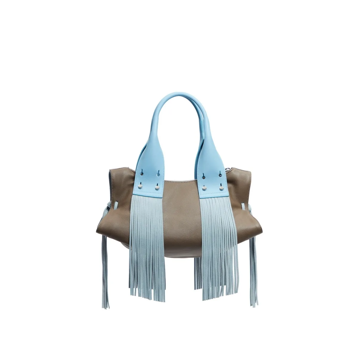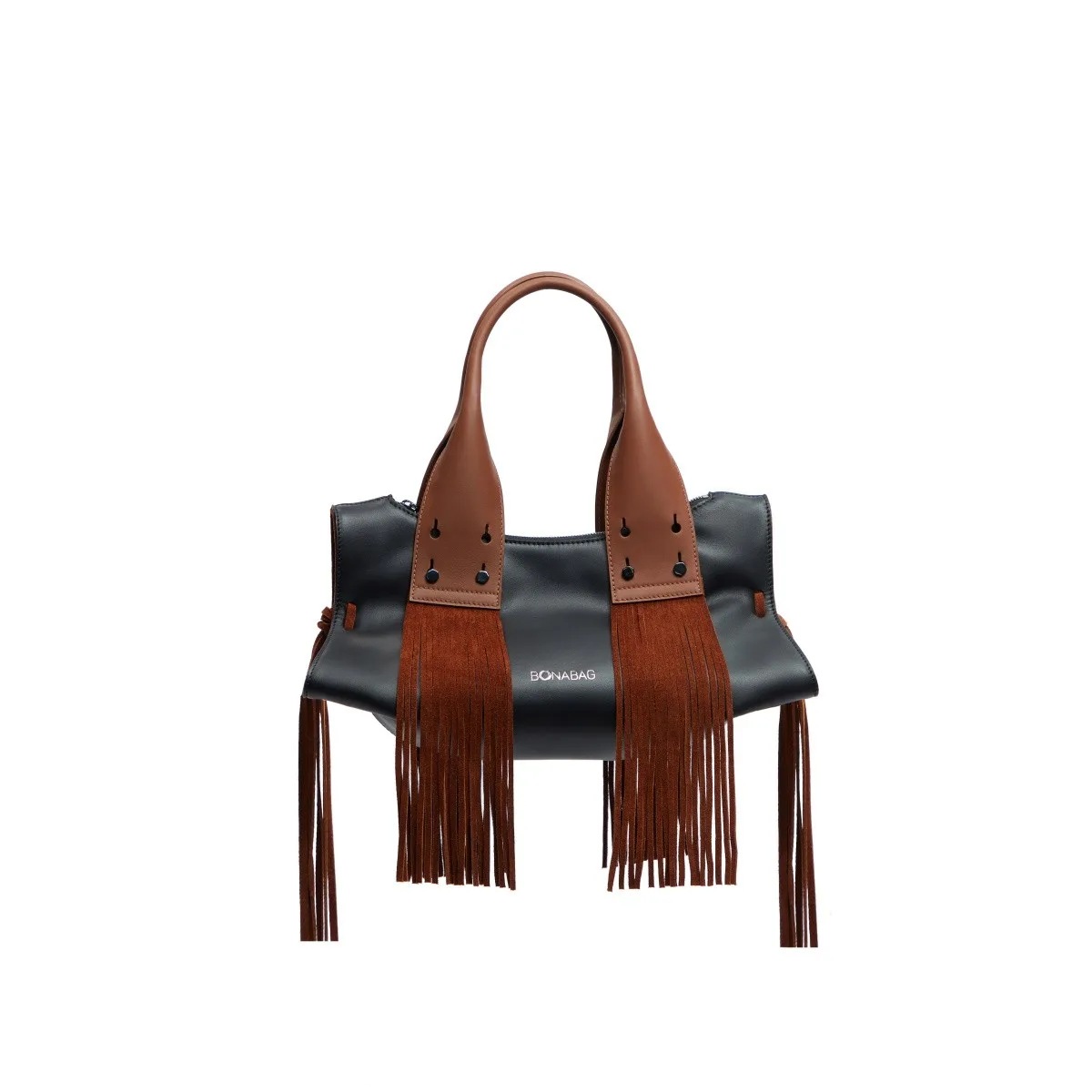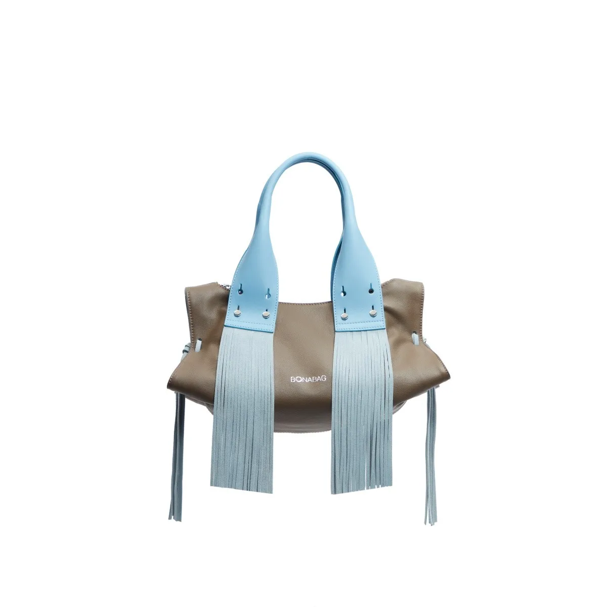Shirred and tasselled. Elliptic opening shape. Unique sided shape like a piece of art. Pre-modern and oversize handle.