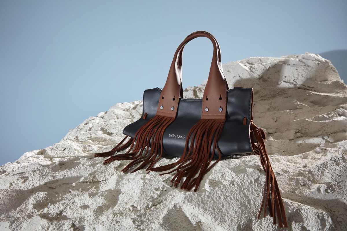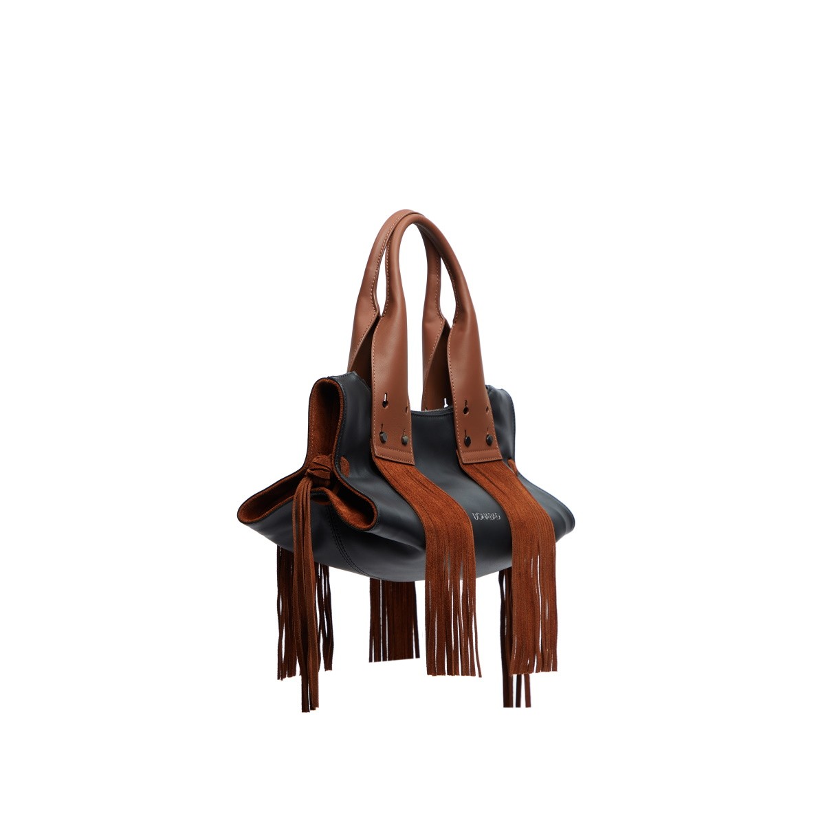 Shirred and tasselled. Elliptic opening shape. Unique sided shape like a piece of art. Pre-modern and oversize handle.
