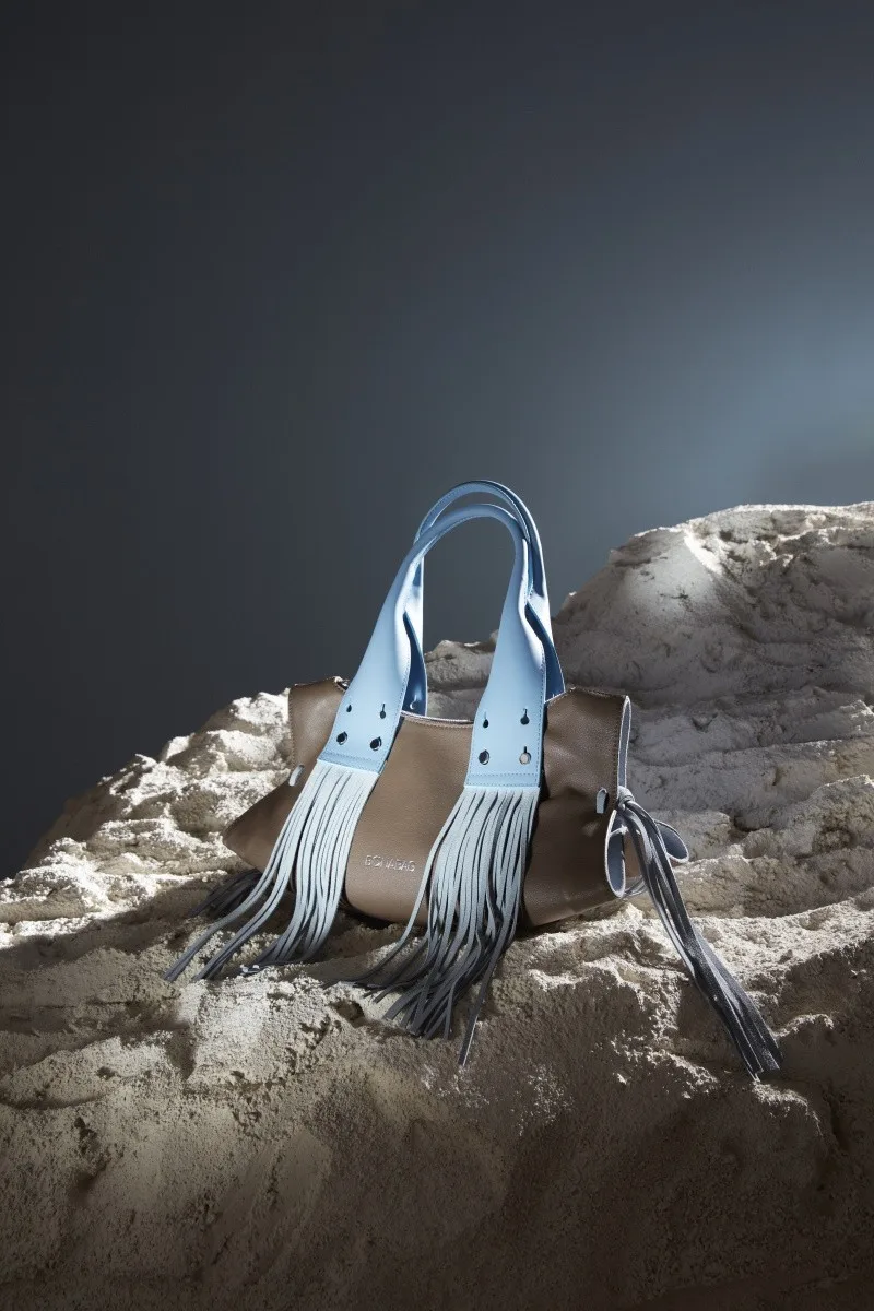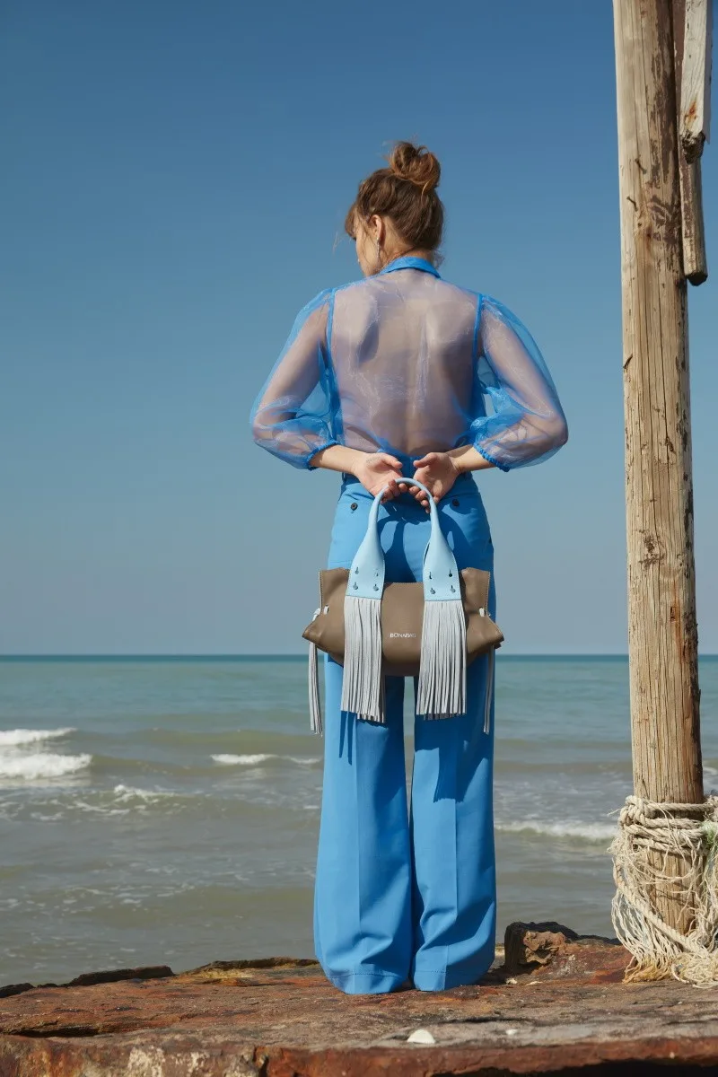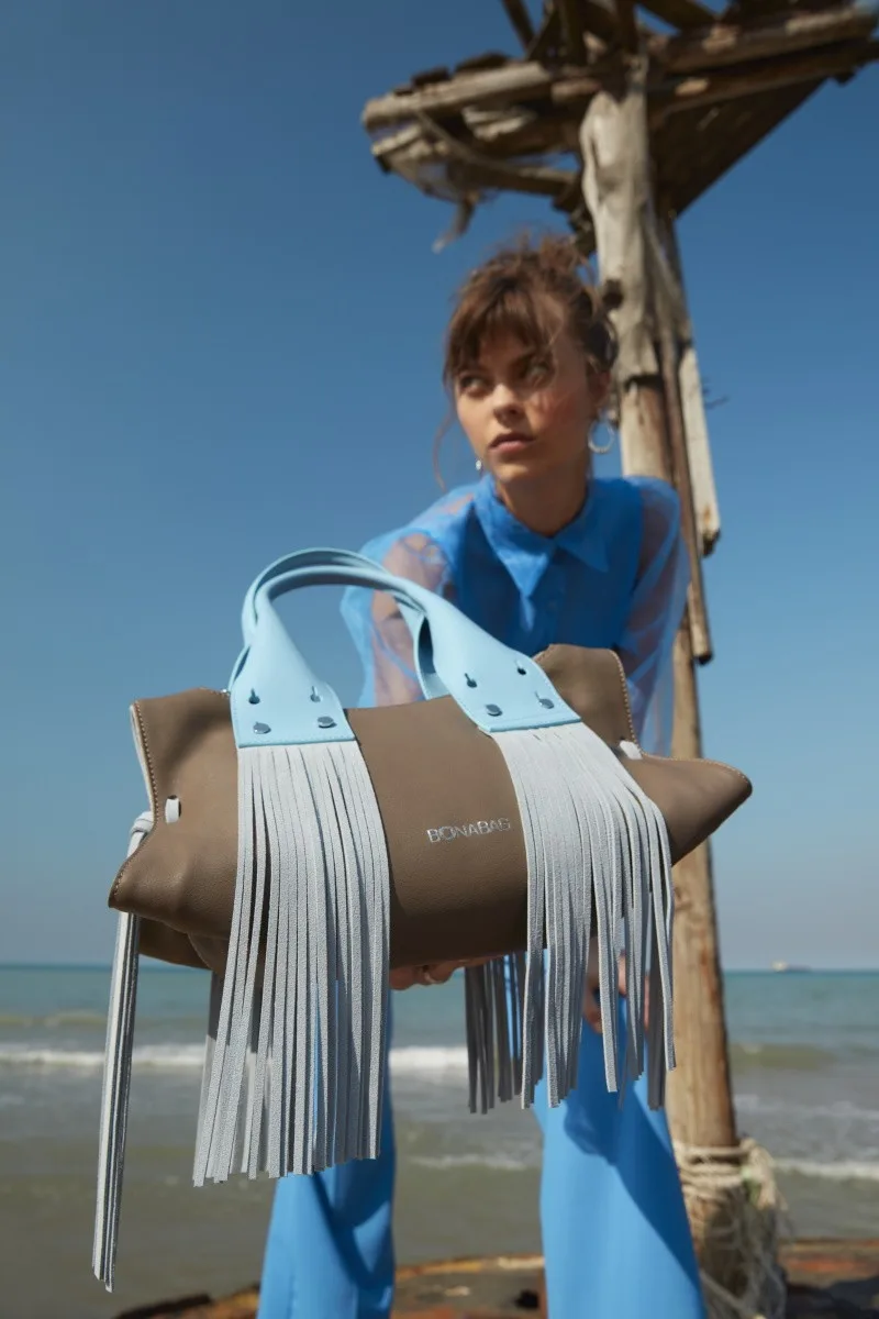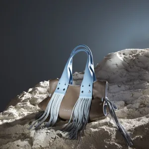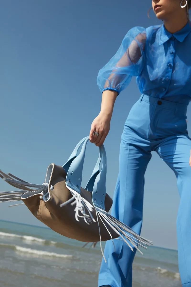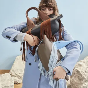 Shirred and tasselled. Elliptic opening shape. Unique sided shape like a piece of art. Pre-modern and oversize handle.