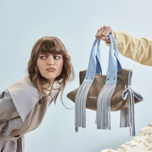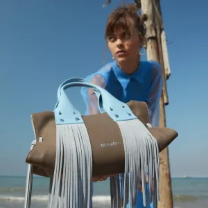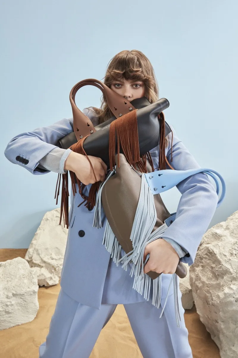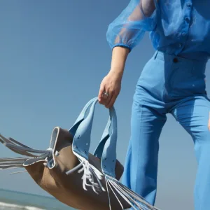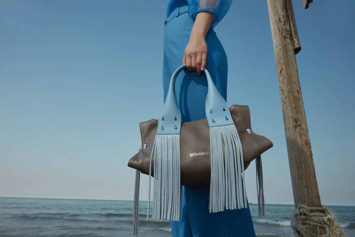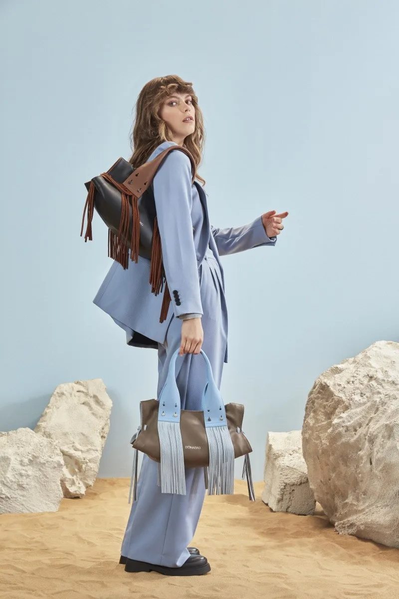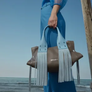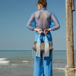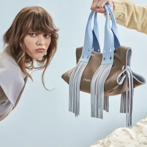 Shirred and tasselled. Elliptic opening shape. Unique sided shape like a piece of art. Pre-modern and oversize handle.