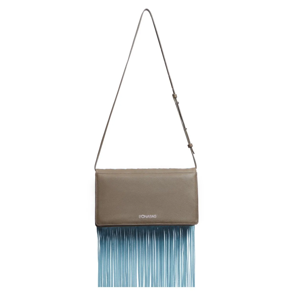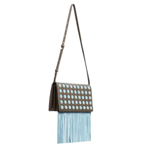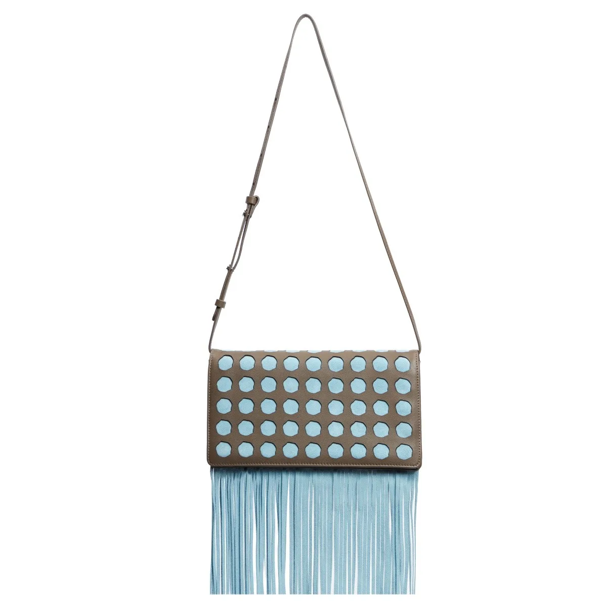 Icon-shaped laser cuts. Horizontal rectangular geometric figure. Short tasseled, hippie style. Large interior volume.