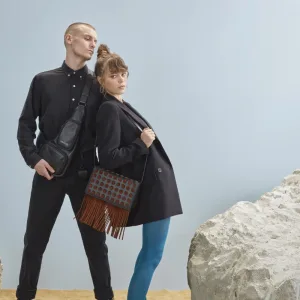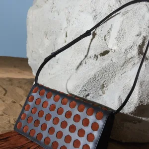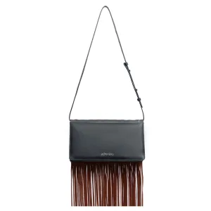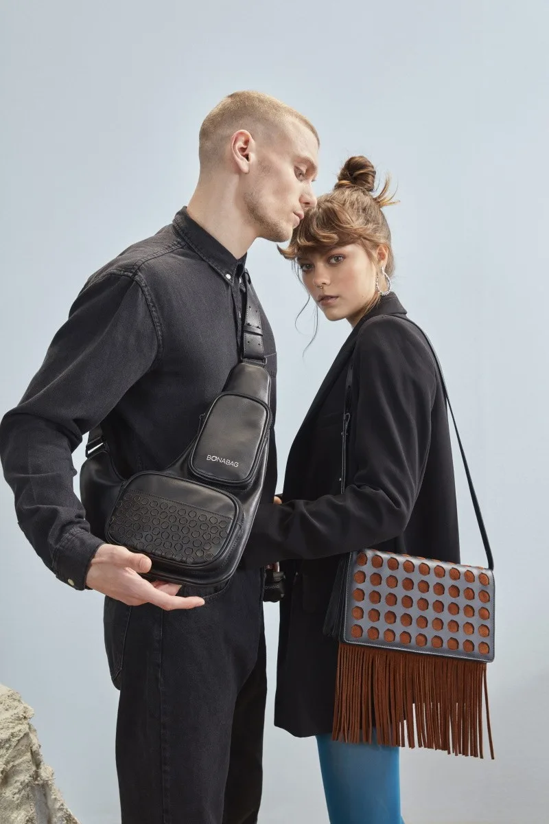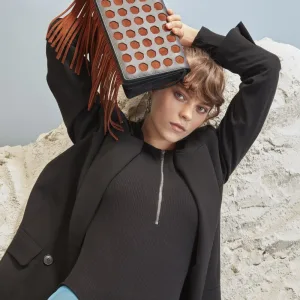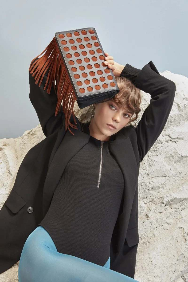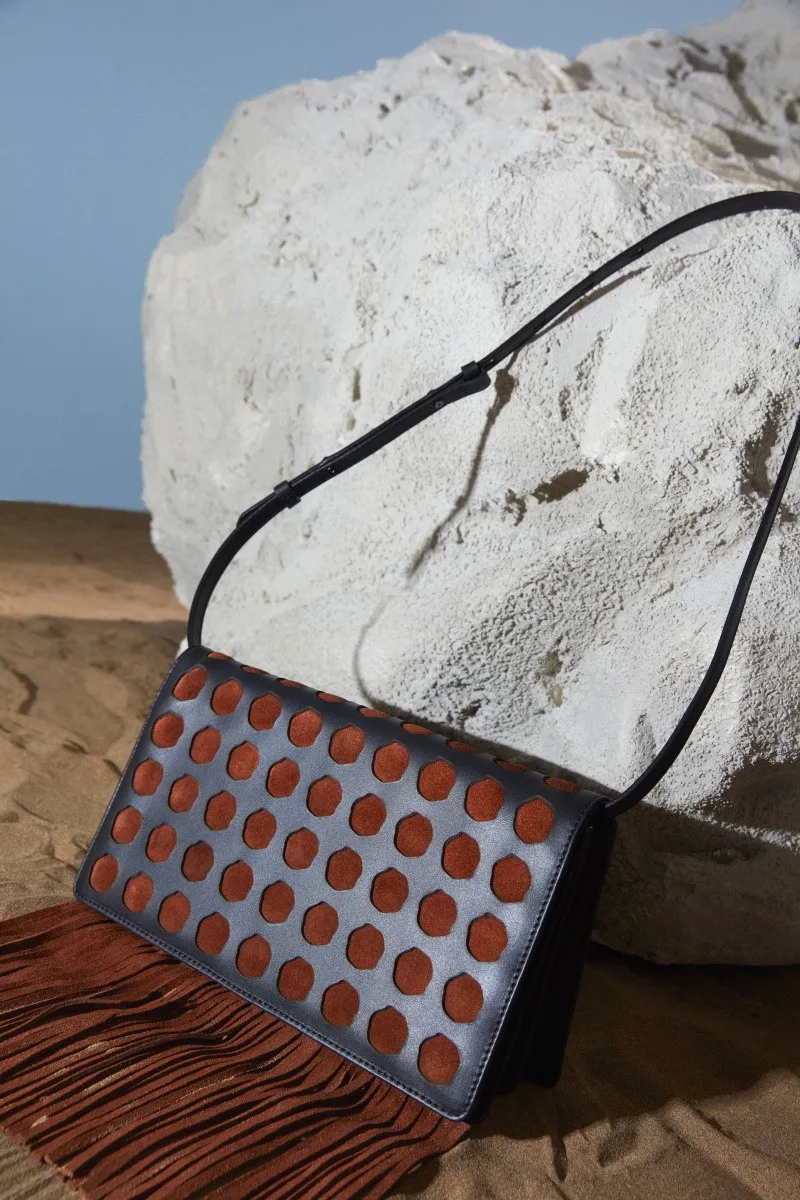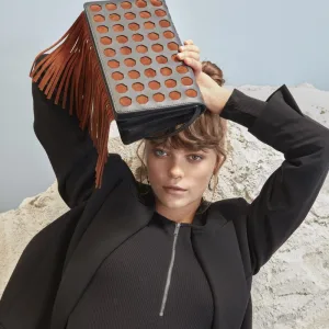 Icon-shaped laser cuts. Horizontal rectangular geometric figure. Short tasseled, hippie style. Large interior volume.
