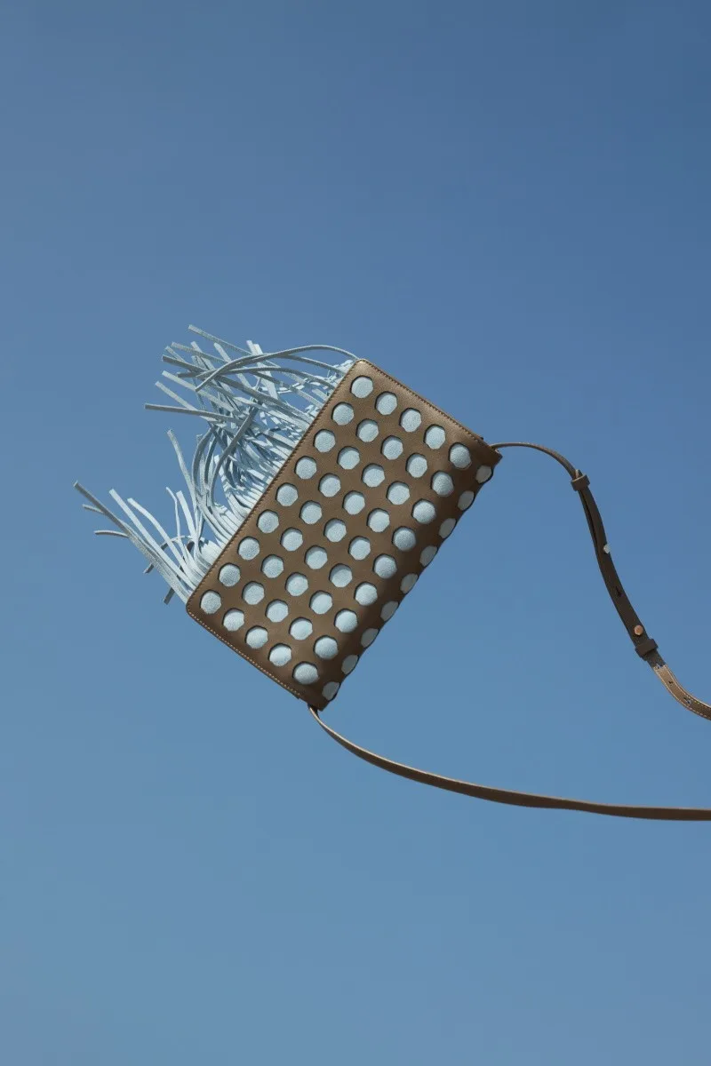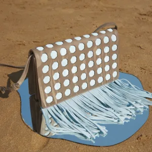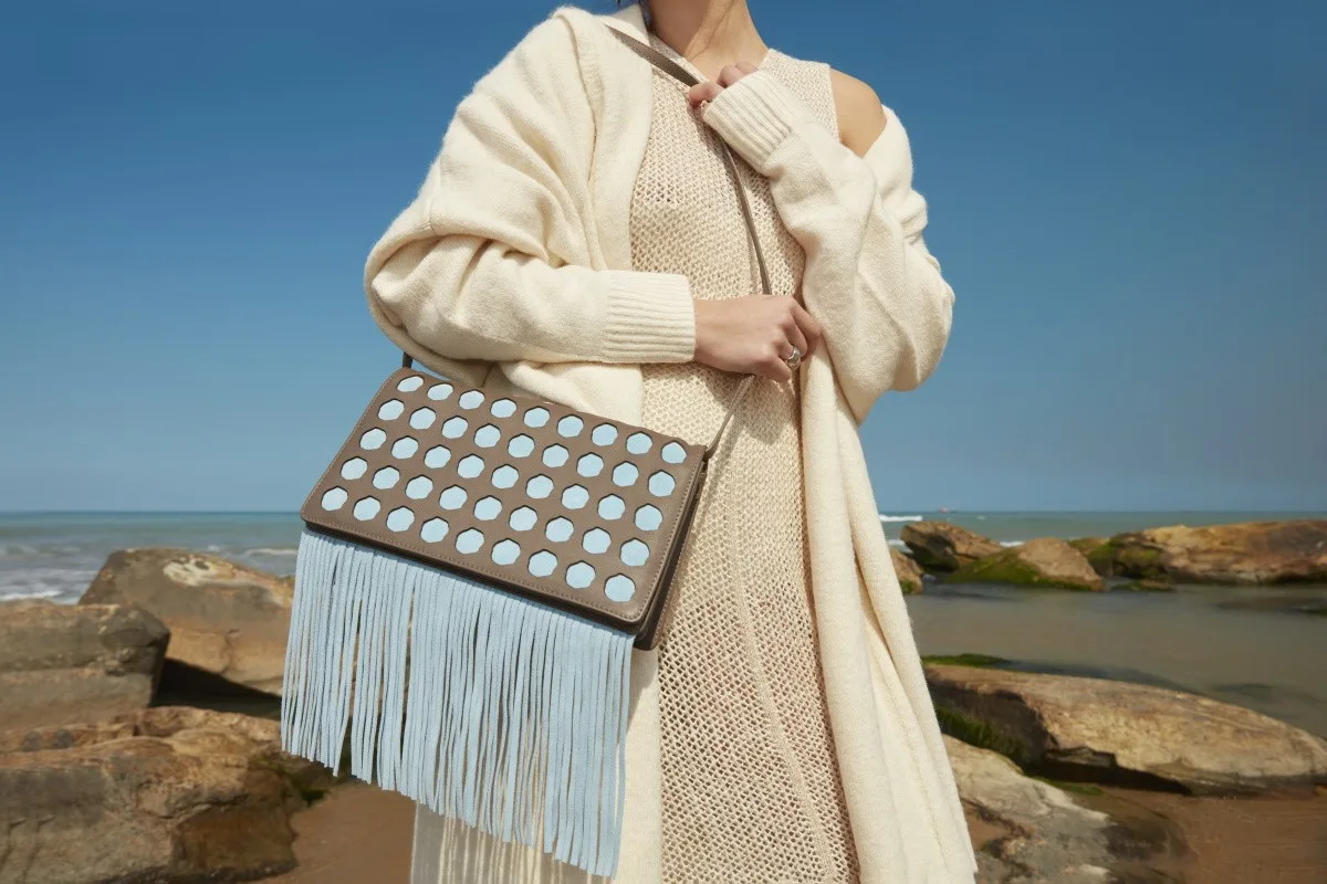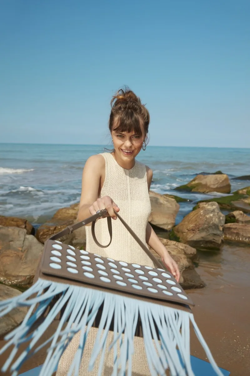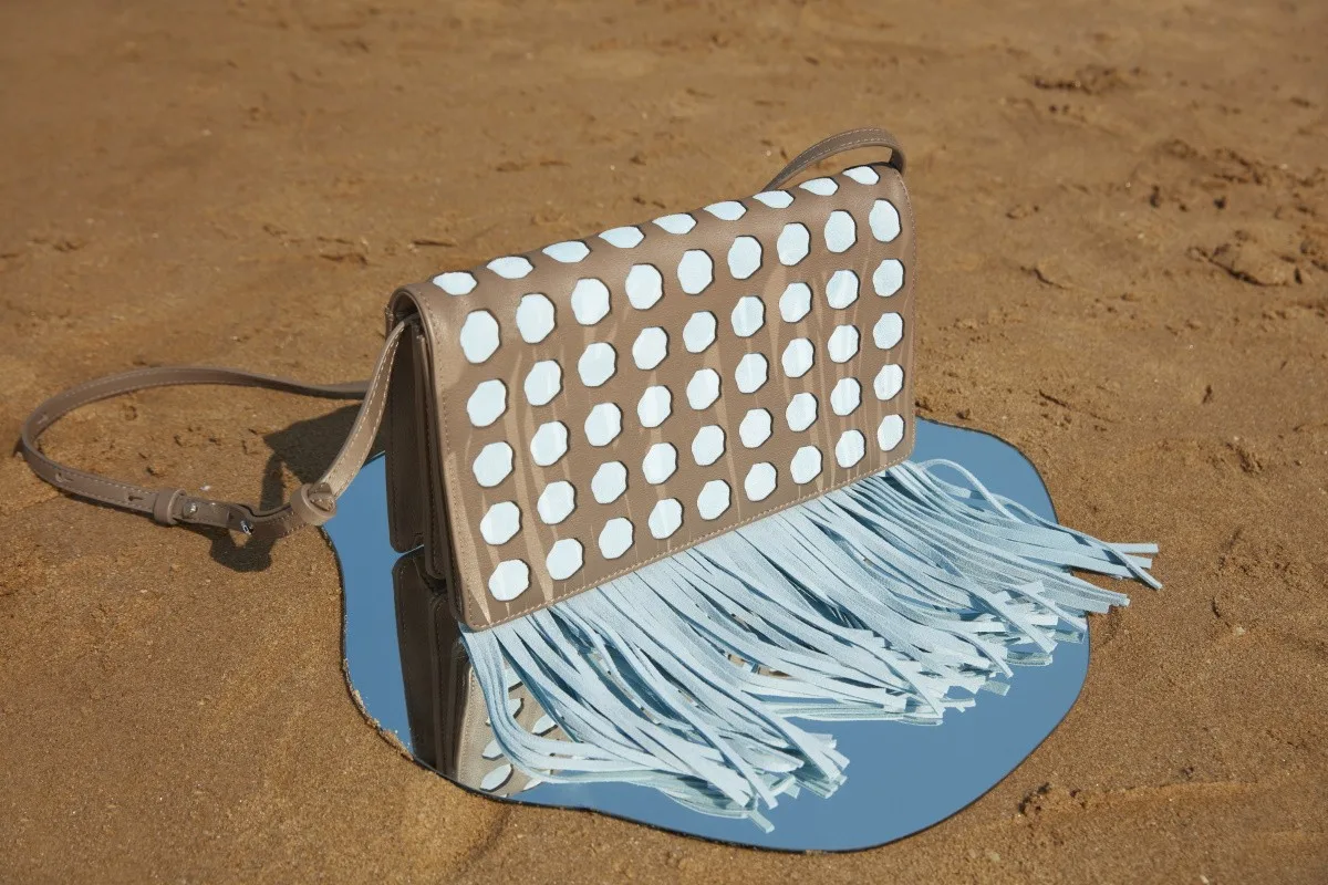 Icon-shaped laser cuts. Horizontal rectangular geometric figure. Short tasseled, hippie style. Large interior volume.