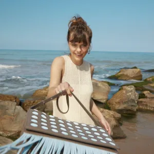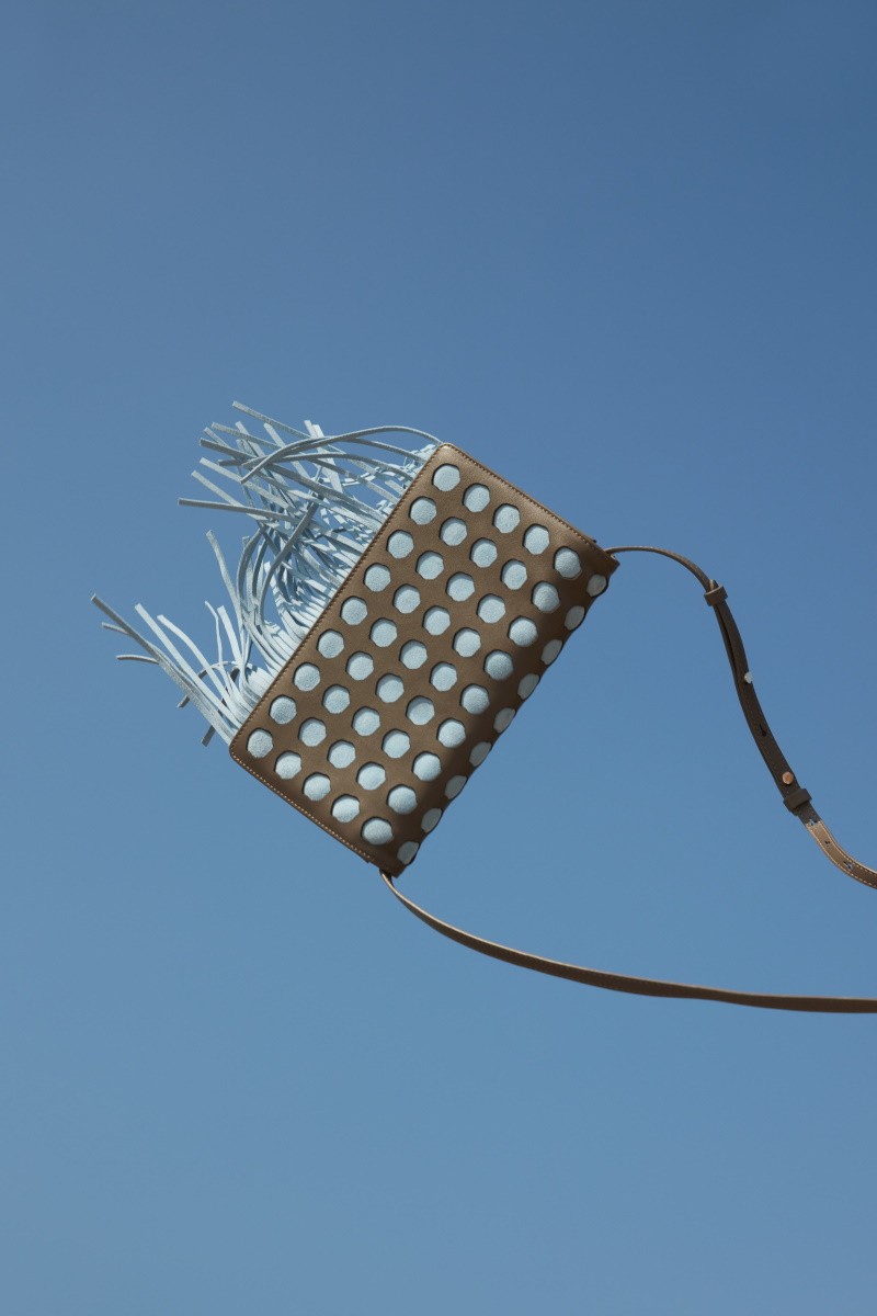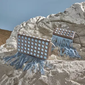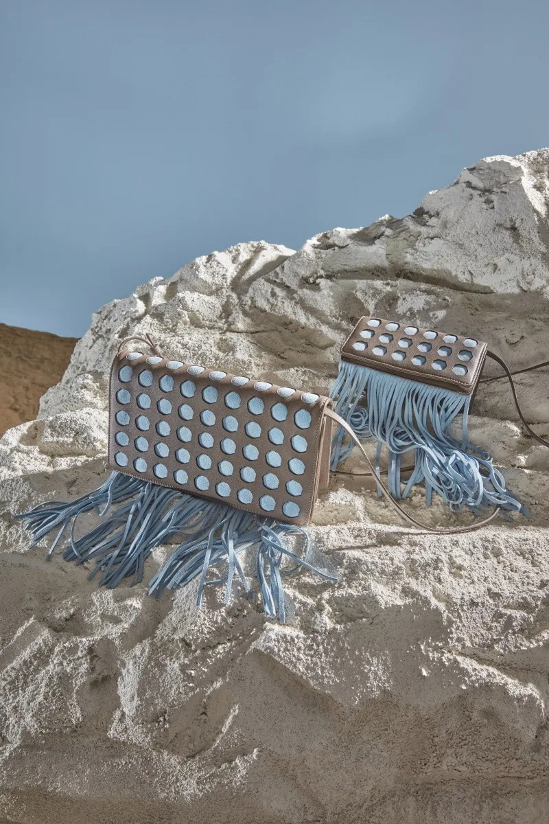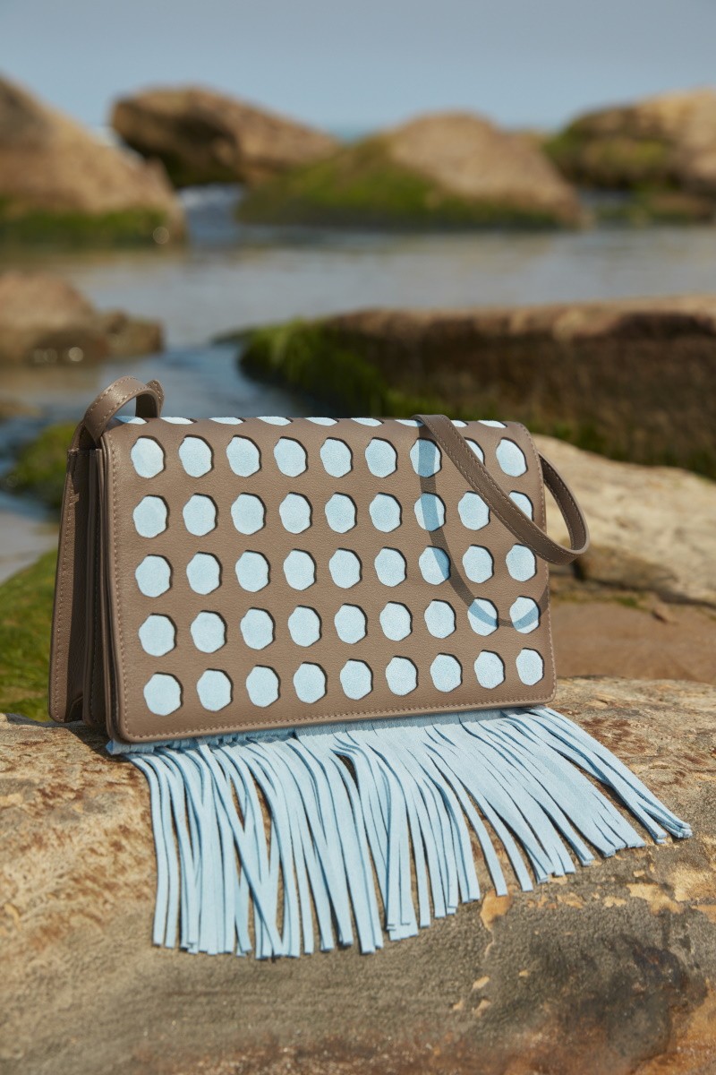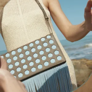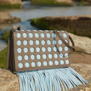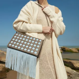 Icon-shaped laser cuts. Horizontal rectangular geometric figure. Short tasseled, hippie style. Large interior volume.