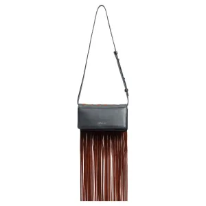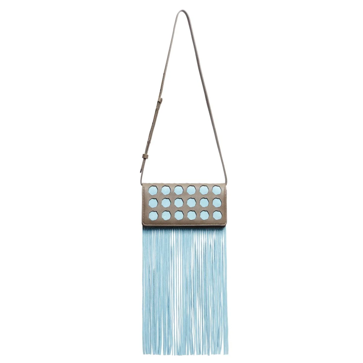 Icon-shaped laser cuts. Horizontal rectangular geometric figure. Long tasseled, hippie style. Looks mini bag, but still large interior volume.