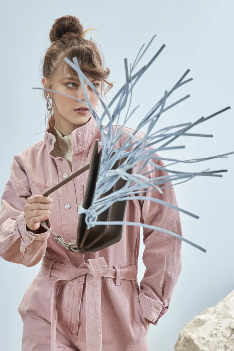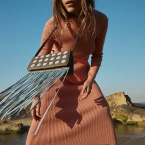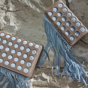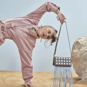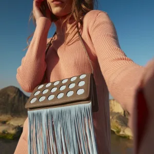 Icon-shaped laser cuts. Horizontal rectangular geometric figure. Long tasseled, hippie style. Looks mini bag, but still large interior volume.