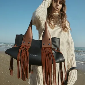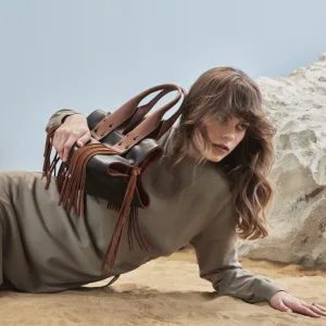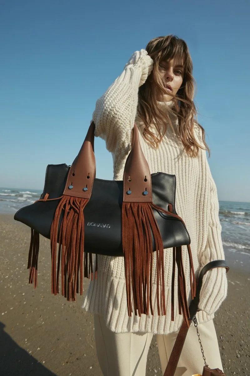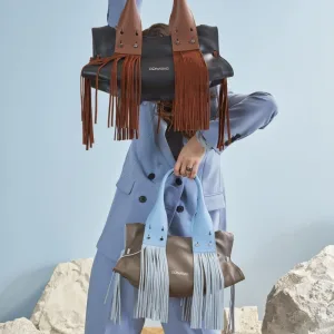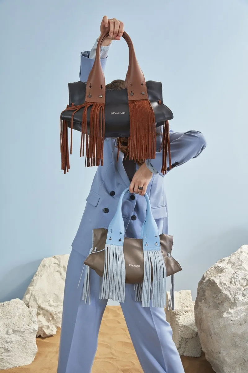 Shirred and tasselled. Elliptic opening shape. Unique sided shape like a piece of art. Pre-modern and oversize handle.