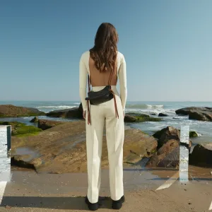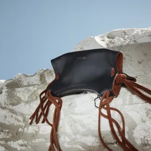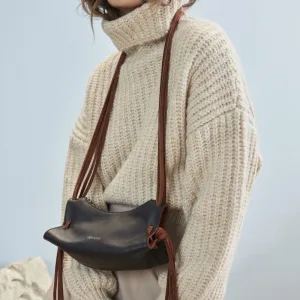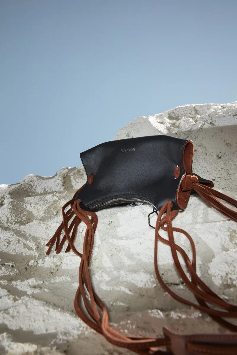 Shirred and tasseled. Elliptic opening shape. Unique sided shape like a piece of art. Crossbody strap seems as long tassels.