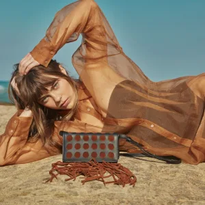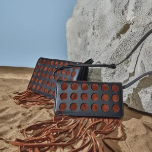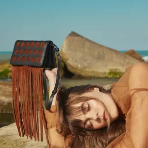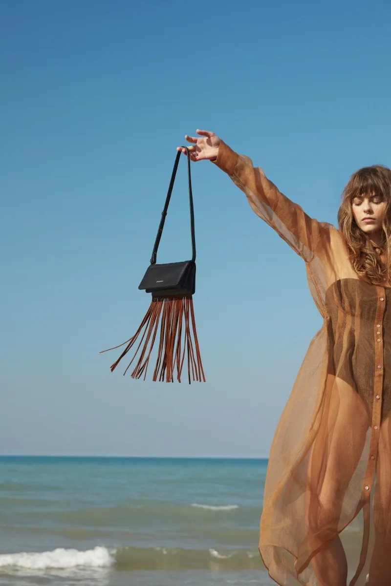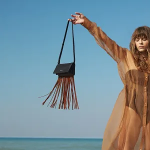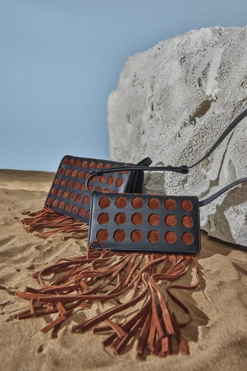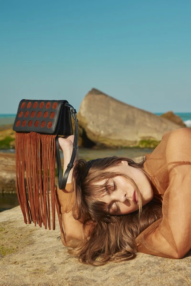 Icon-shaped laser cuts. Horizontal rectangular geometric figure. Long tasseled, hippie style. Looks mini bag, but still large interior volume.